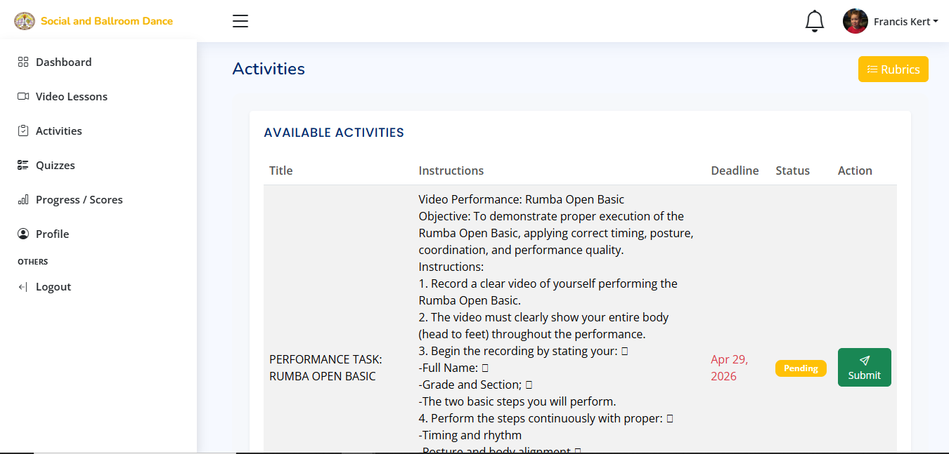 Students can submit their dance performance tasks for evaluation, allowing them to track their progress and improve their skills.