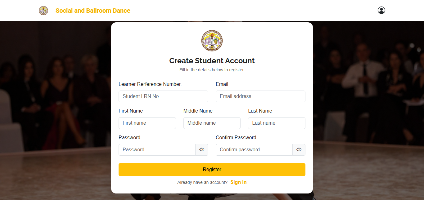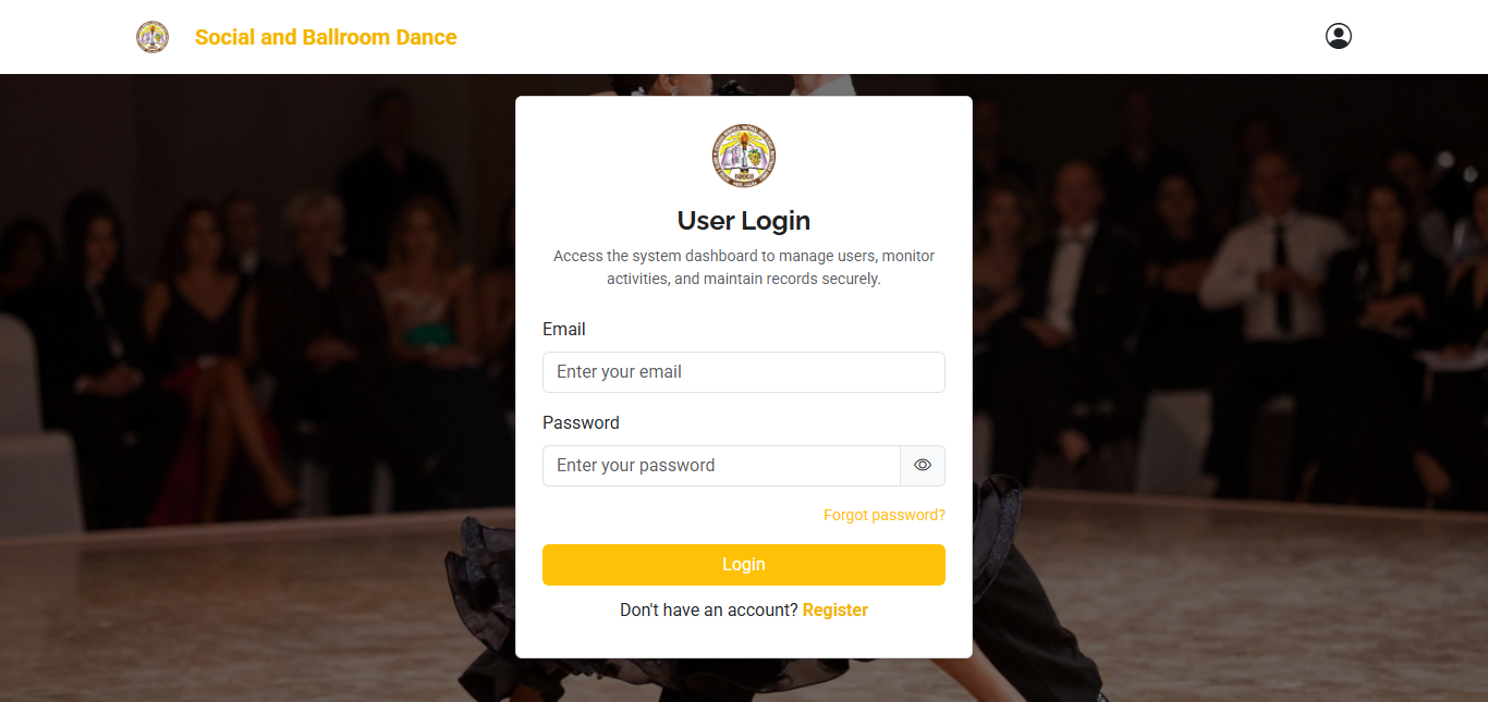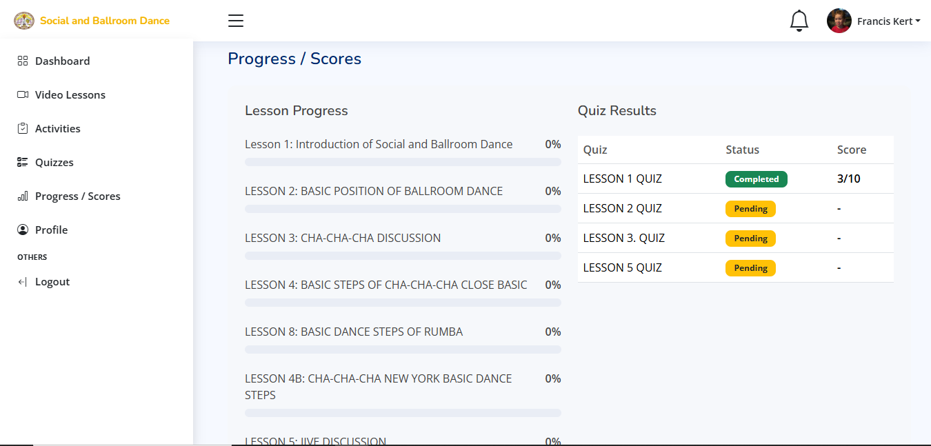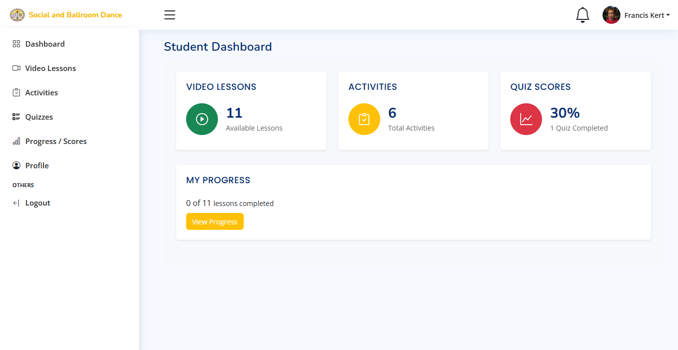 Access the main dashboard where students can browse available dance lessons and system features.