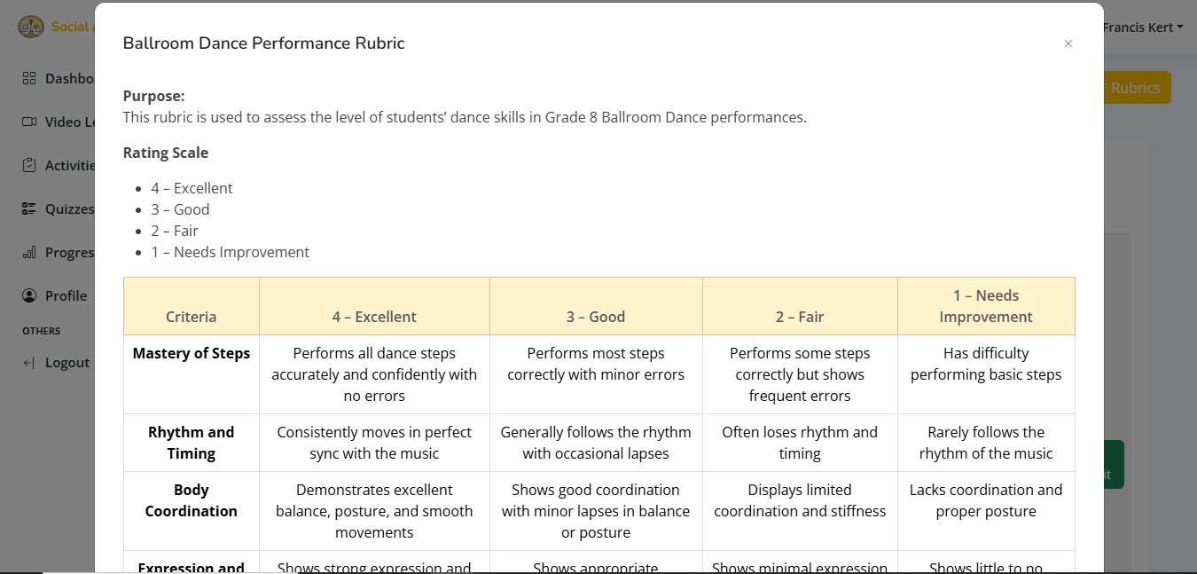 The Ballroom Dance Performance Rubric evaluates students based on timing, technique, coordination, expression, and choreography execution to ensure fair assessment of their dance performance and skill development.